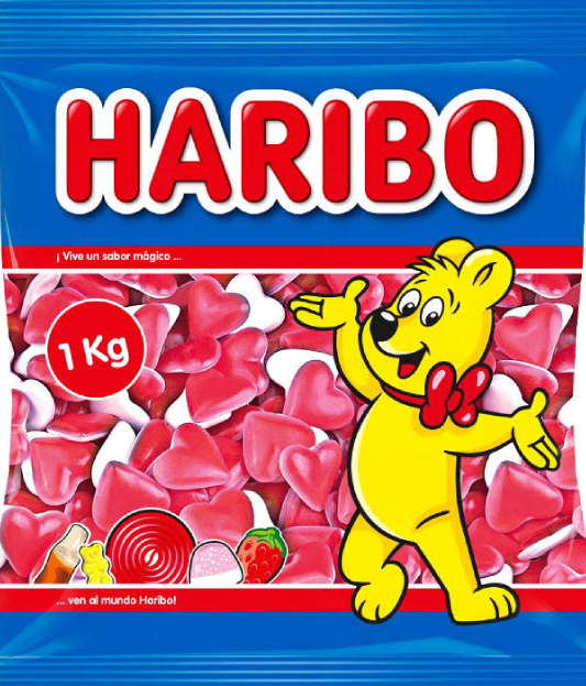 Golosina de goma de corazón bicapa, con sabor a fresa y base de nata.